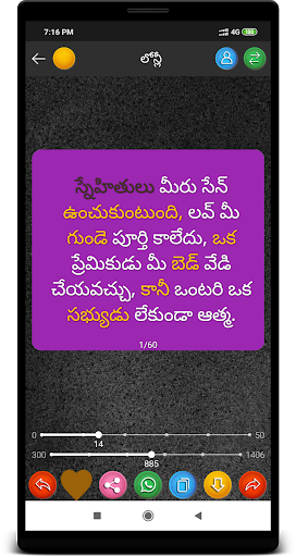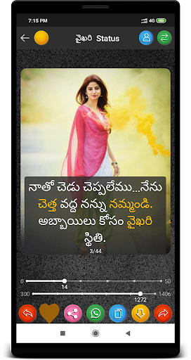 Telugu status , sms & quotes App cover almost all Telugu Status , Famous quotes Saying by legends and sms & Twenty different categories of best selected images with very easy sharing option.