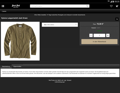 Informazioni sull'app Tutti gli articoli possono essere visualizzati con immagine e descrizione dettagliata, semplicemente salvato sul Blocco note o ordinato direttamente. Può essere pagato con tutti i metodi di pagamento comuni come Paypal, carte di credito, acquisto in conto o pagamento anticipato.