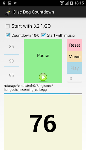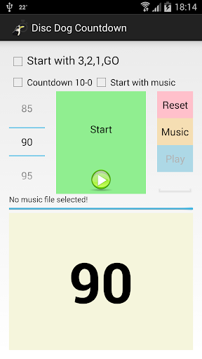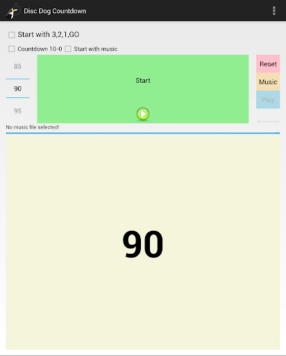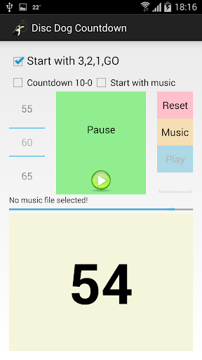 Disc Dog Countdown is universal countdown app for disc dog competitions. You can easy set the time between 0 and 120s and let the program count down automatically. You can choose to start with "Time start" or "3,2,1,go". The app automatically say remaining time at 60, 30, 10, 5, 4, 3, 2, 1 seconds and "Time" at the end.