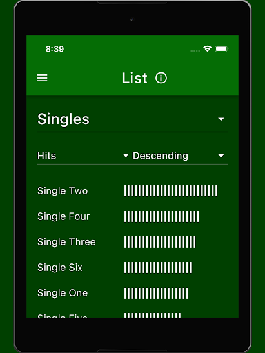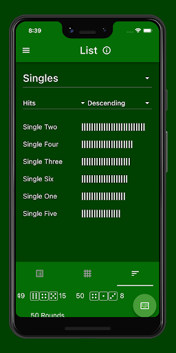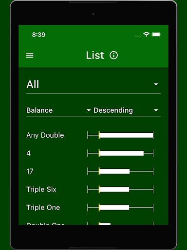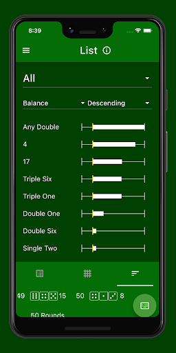 This view contains a list showing all betting options of a group (e.g. for single dice, combinations or sums) with the number of their hits. Above the list, the corresponding group can be selected. When selecting the group 'All', all betting options are listed simultaneously. Pressing the list entry opens the detailed view of the corresponding betting option.