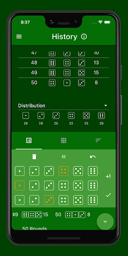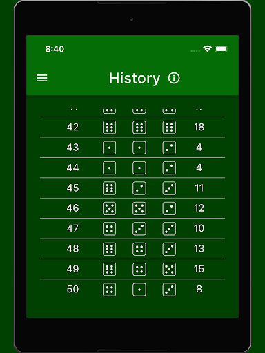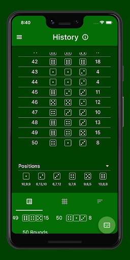 In this view all played rounds are listed. For each round, there is a list entry with the round number, the three dice rolled, and the sum of the dice. The next rounds can be entered using the button at the bottom right or generated randomly.