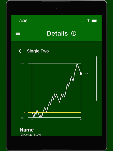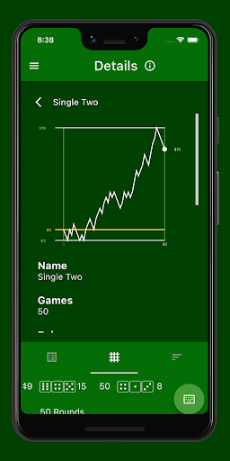 In this view all details of a selected betting option are displayed. You can see the chart of the game history, i.e. the result (win/loss) over time. Just as if you had played this betting option only. In addition, there is more information and a list of all rolls that this betting option represents.