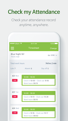 The app sends reminder push messages at scheduled times to help you remember to clock in and out.