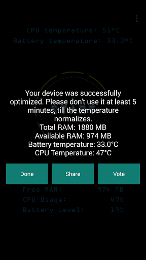 This app is highly effective in increasing batter life in heavy usage and battery performance in multimedia and gaming. It closes apps that are likely to cause overheating, and prevents the phone temperature from rising.