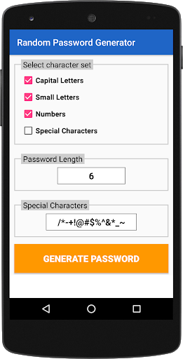 This app generates random passwords that can include numbers, upper/lowercase letters and special characters.