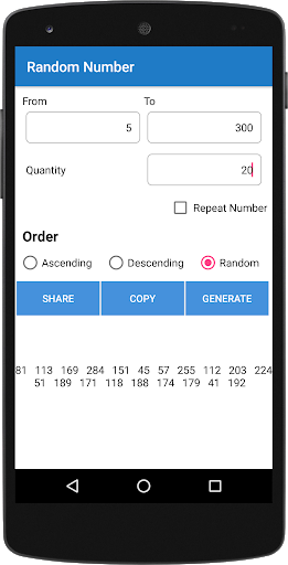 Random Number Generator is for generating random with Ascending,Descending and random order.