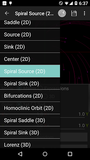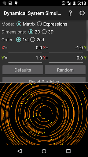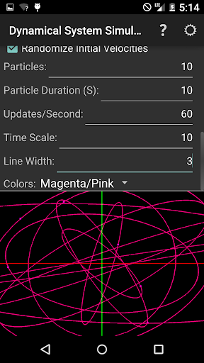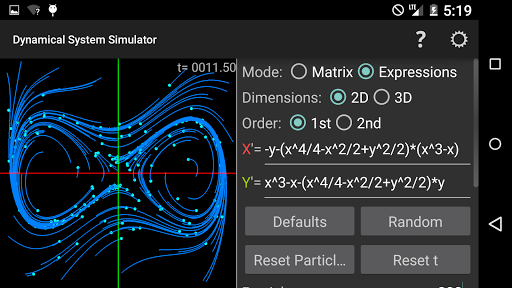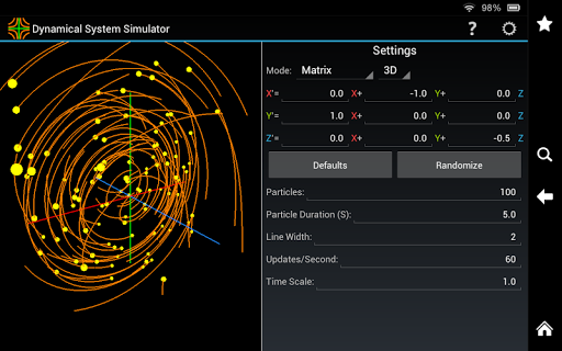 Dynamical System Simulator animates 2D and 3D first-order and second-order systems of differential equations in real time. Watch animated particles move through space leaving a trail in their wake. Great for verifying slope fields, phase portraits, and gaining an intuitive understanding of dynamical systems. Knowledge of differential equations is assumed but the help screen will point you to additional sources of information. The app is pre-loaded with several well known dynamical system configurations that can be selected from the navigation drawer. Parameters for a particular system type can be randomized.