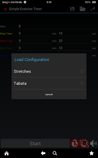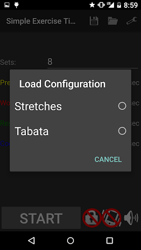 Save and load any number of workout configurations. The app comes with the standard Tabata configuration preloaded (8 sets of alternating 20 seconds of work and 10 seconds of rest). It also comes with a configuration for stretching.