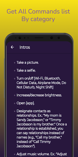 Our App provides a complete guide list of Siri Commands, voice commands assistance by Apple. Siri commands for android are divided into categories: