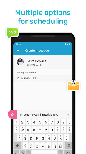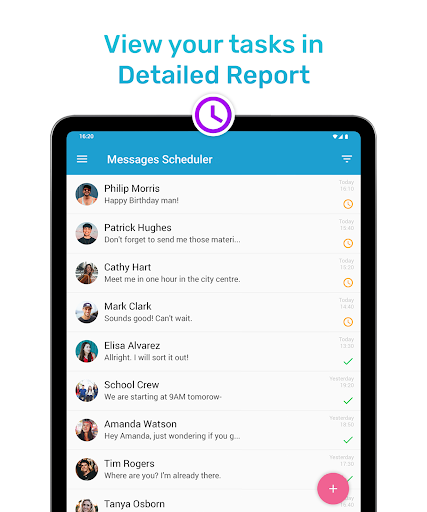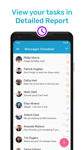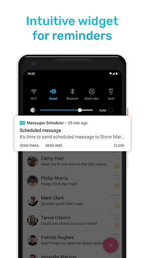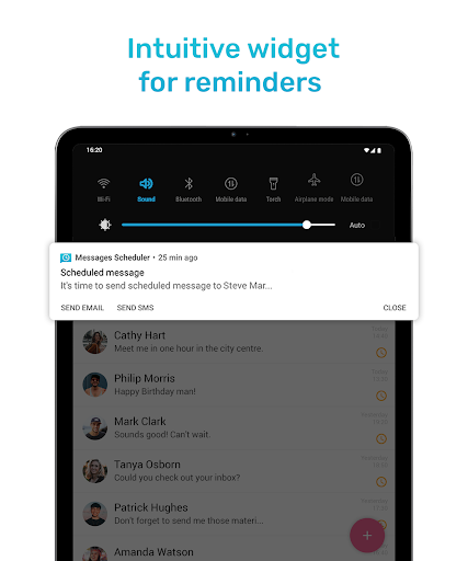 With Messages Scheduler for Android never forget to send a message. Create Scheduled Message with reminder on selected time and date. You can send SMS or MMS with text, pictures, video or Gif. Intuitive and fast SMS Reminder/Scheduler.
