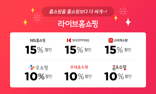 GS홈쇼핑(지에스홈쇼핑), CJ홈쇼핑(CJ오쇼핑), 롯데홈쇼핑, 현대홈쇼핑, 홈앤쇼핑, NS홈쇼핑(농수산홈쇼핑), 아임쇼핑, K쇼핑, W쇼핑, 신세계TV쇼핑, 쇼핑엔티를 모바일로 주문하면 최대 15% 할인/적립됩니다.