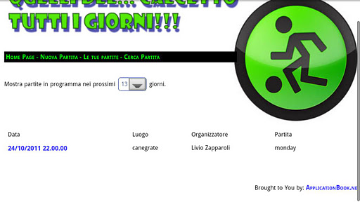 Da oggi organizzare le tue partite di calcetto molto Pi semplice... basta spese inutili in sms e chiamate... con questa app puoi organizzare le tue partite su facebook e invitare tutti i tuoi amici... monitorando in tempo reale quanti giocatori hai gi quot;reclutatoquot; e permettendo anche agli amici di trovare altri giocatori che mancano all39;appello... e il tutto in maniera assolutamente gratuita