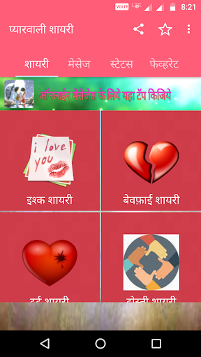 प्यारवाली शायरी - एक हिंदी ऐप जिसमे है शायरी,मैसेज और व्हाट्सअप स्टेटस का खजाना ।