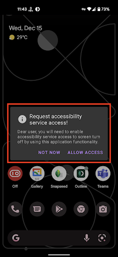 Dear user, you will need to enable accessibility service access to screen turn off by using this application functionality.