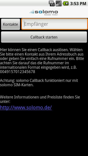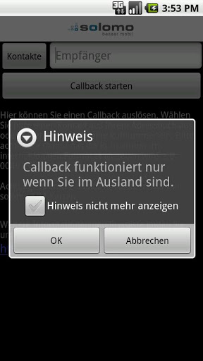 Mit der solomo Callback App knnen Sie im Ausland komfortabel das solomo Callback Verfahren nutzen, um gnstige Gesprche zu fhren. Im Gegensatz zu unserer quot;mein solomoquot; App wird keine Anmeldung und kein Internetzugang bentigt. Weitere Informationen und Preise fr Callback Anrufe finden Sie unter http:www.solomo.deSie haben Funktionswnsche oder Probleme mit unserer App? Schauen Sie doch in unserem forum unter http:forum.solomo.de vorbei, oder senden Sie uns eine email an service@solomo.de. Wir freuen uns ber jedes Feedback.ber solomoDie solomo GmbH solomo wurde im Jahr 2005 in Frndenberg gegrndet und hat sich auf die Entwicklung und Bereitstellung innovativer internet und Mobilfunkdienstleistungen spezialisiert. In allen Bereich stellt solomo nicht nur hchste Qualittsansprche an die eigenen Produkte, sondern legt auch besonderen Wert auf eine enge Kundenbeziehung und ausgezeichneten Service.solomo hat sich als so genannter MVNO Mobile Virtual network Operator im Jahr 2007 auf dem deutschen Mobilfunkmarkt positioniert. Mittlerweile bietet solomo zwei eigene Tarife fr preisbewusste Kunden an. Der mehrfach aus unabhngigen Tests als PreisLeistungsSieger hervorgegangene Tarif solomo 085Cent wei vor allem durch seine deutschlandweit und rund um die Uhr niedrigen Preise und seine einfache, bersichtliche Tarifstruktur zu berzeugen. Des Weiteren bietet solomo mit dem Tarif solomo pro einen attraktiven AllroundTarif fr Gesprche im und ins In und Ausland. Ergnzt wird der proTarif durch einen VoiceoverIP VoIPService, der es den Kunden, unabhngig von der SIMKarte, erlaubt, im In und Ausland ber vorhandene Datennetze WLANDSL zu sehr gnstigen Konditionen zu telefonieren. solomo ergnzt seine MobilfunkProduktpalette laufend durch neue innovative Dienstleistungen, wie etwa den Versand von iSMS aus dem Internet oder den solomo TweetPushDienst, der es Nutzern des MicrobloggingDienstes twitter erlaubt, eingehende TwitterNachrichten direkt in Form einer PushNotification auf dem eigenen Handy zu empfangen.Seit Mitte 2010 ist die solomo GmbH auch als sogenannter Enabler auf dem Mobilfunkmarkt ttig und bietet Unternehmen und Marken die einmalige Chance, eigene innovative Mobilfunkprodukte zu realisieren, wobei die Mglichkeiten vielfltig sind und von einer Whitelabel OutoftheBox Lsung bis hin zu einem bis ins kleinste Detail individuell gebrandeten Mobilfunkprodukt reichen.
