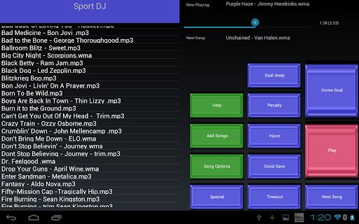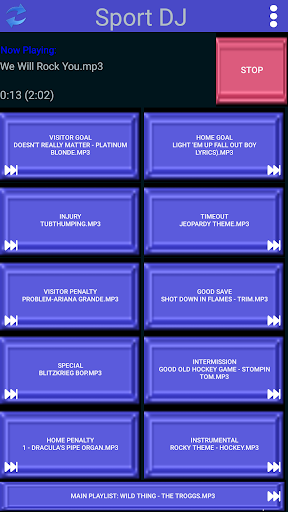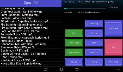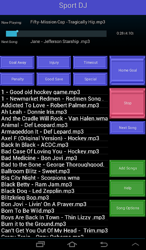 The application features 10 different playlist buttons for various events during the game such as for a home team goal, a good Save, a visitor penalty or goal, timeout, intermission, home team penalty, instrumental and after the player gets up from an injury. You can customize the button names for any events you want or to fit any other sport.