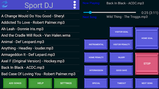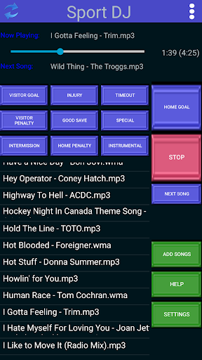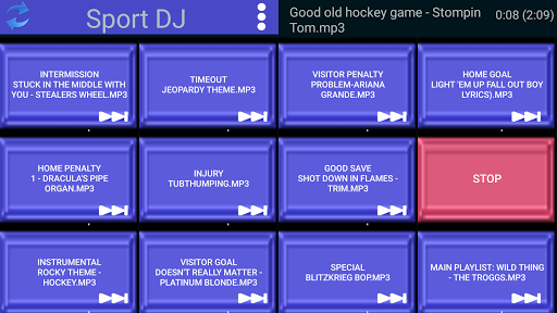 Sport DJ is an application specifically designed for playing music at sporting events. It allows you to play exactly the right song at exactly the right moment. While it was designed for Hockey and Lacrosse it is great for football and baseball and can be used for any event where music is played between or during play.