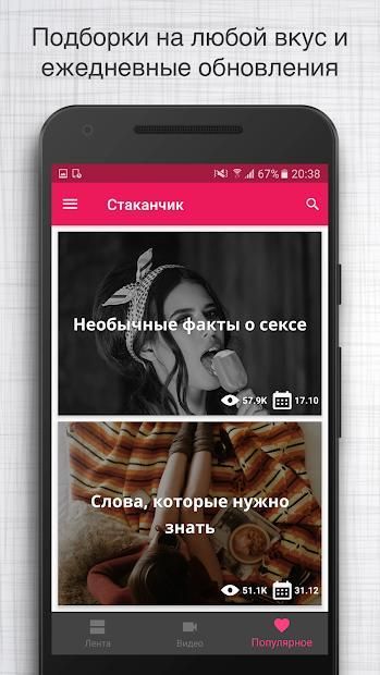 Стаканчик - это лучшее приложение о самом интересном и необычном. Тысячи научных статей и психологических тестов помогут каждый день развиваться и взглянуть на мир другими глазами.