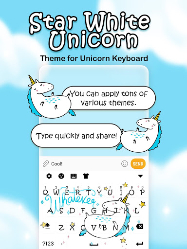 ❤ Dear girls, welcome to the world of unicorns - where magic begins! Don't miss the chance to have Star White Unicorn on your keyboard! Designed specially for all cute girls out there, this lovely "Star White Unicorn Keyboard Theme for Girls" changer will simply exceed all your expectations and will give your phone a totally new shine! Enjoy texting message like never before thanks to your new Star White Unicorn Keyboard Theme for Girls!