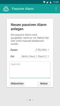 Der passive Alarm bietet zusätzlich die Möglichkeit, einen Alarm kurz vorher zu definieren. Dabei legen Sie den Inhalt der Nachricht und ein bestimmtes Zeitfenster fest. Melden Sie sich in diesem Zeitraum nicht zurück, wird nach Ablauf der Zeit der Alarm automatisch ausgelöst. Ein weiterer Mitarbeiter kann mit Hilfe der Rückruffunktion oder durch die Benachrichtigung der Polizei schnell reagieren.