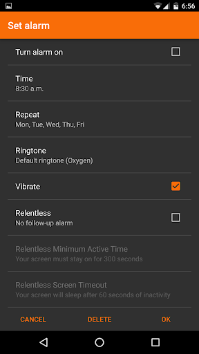 Relentless alarm forces you to use your phone for a duration of time before the alarm can be shut off for good. Don't worry, you won't be disturbed by the alarm constantly ringing. You can use your phone in peace, but once you stop and let the screen go to sleep, the alarm will start ringing again. The idea is to force yourself to stay awake for some time so you won't feel as tempted to go back to sleep afterwards, and to let you spend your time productively or enjoyably in the manner you choose instead of making you solve non-stop math problems.