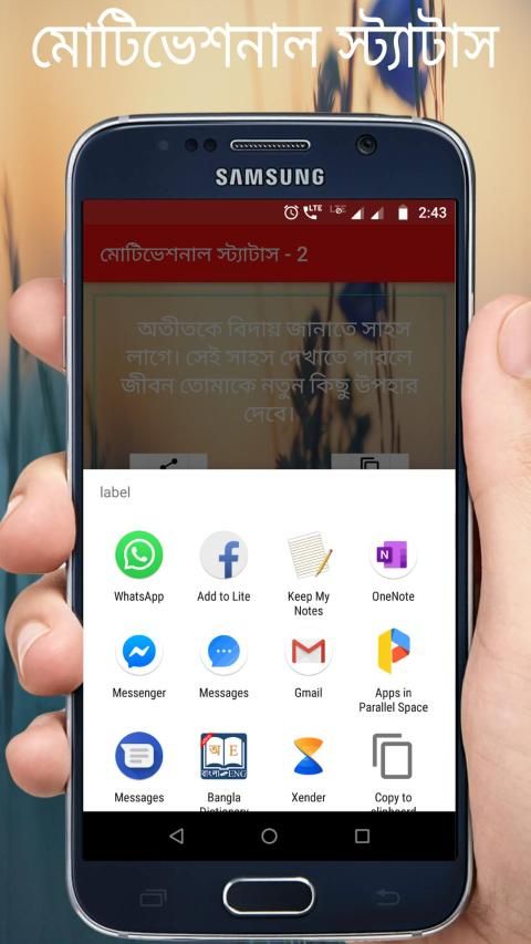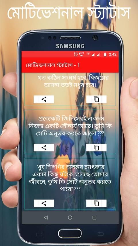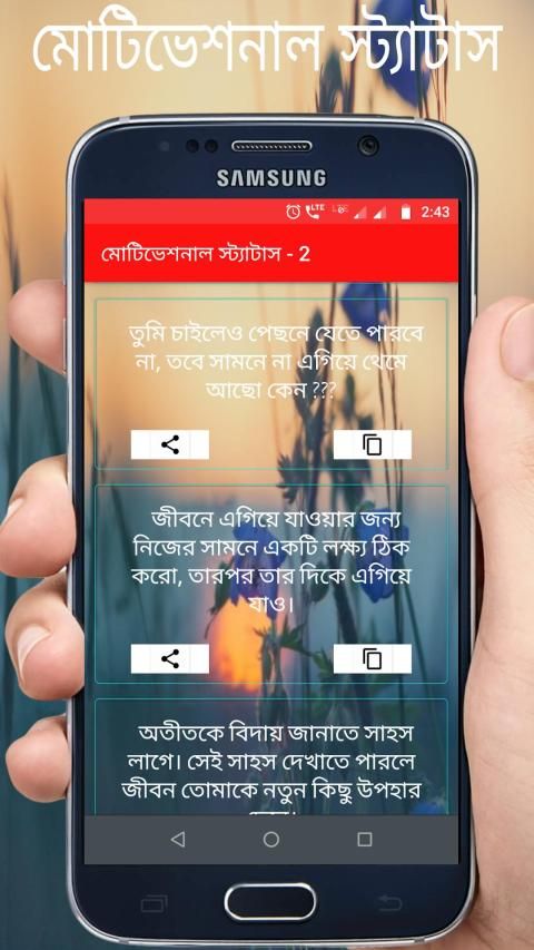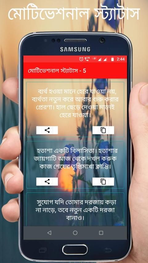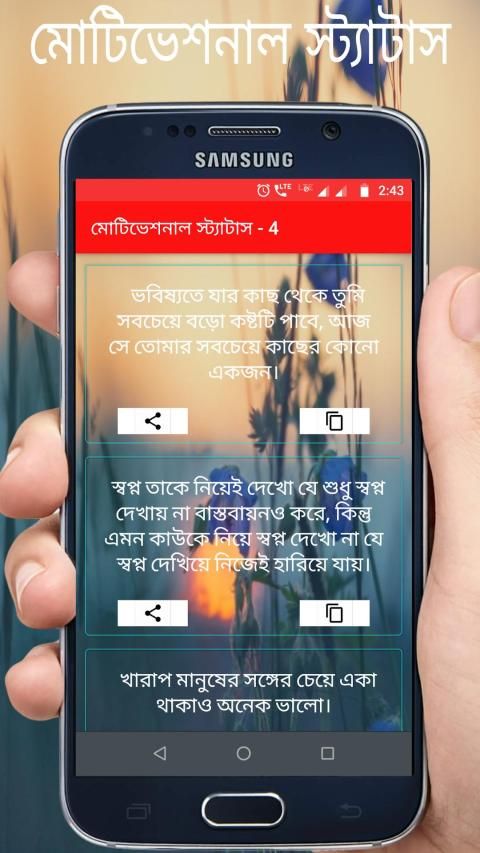 মোটিভেশনাল স্ট্যাটাস আমাদের এই App টির মাধ্যমে আপনি জানতে পারবেন বিখ্যাত ব্যক্তিদের মোটিভেশনাল উক্তিগুলো যা আপনাকে জীবনে চলার পথে এবং সফলতা অর্জনের ক্ষেত্রে অনুপ্রেরণা যোগাবে। মোটিভেশনাল, অনুপ্রেরণামূলক এবং উৎসাহদায়ক হয়ে উঠবে আপনার জীবন। এই App টির মাধ্যমে আপনি খুব সহজেই আপনার বন্ধুদের কাছে মোটিভেশনাল উক্তি গুলি শেয়ার করে আপনার বন্ধুদের কেও জীবনে চলার পথে উৎসাহিত এবং অনুপ্রেরণা যোগাতে পারেন।