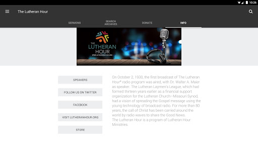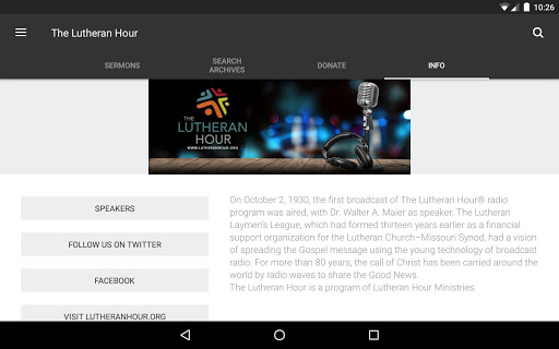 Listen to weekly sermons directly from your mobile device. With this app you have access to the most recent sermons, along with sermon transcripts. Learn about The Lutheran Hour program and our long tradition of renowned Speakers.