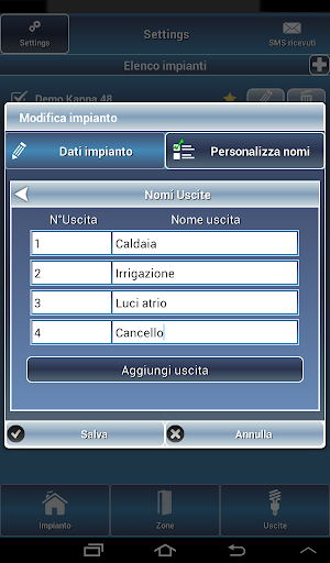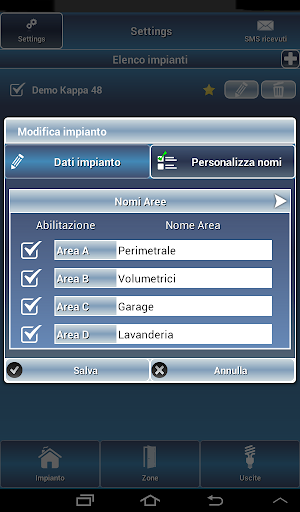- personalizzare i nomi delle aree e delle uscite per gestioni domotiche.