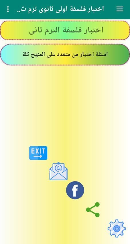 هذا التطبيق يخص طلاب الصف الاول الثانوى لتدريبهم على نظام التابلت والنظام الحديث فى مادة الفلسفة ترم الثانى اسئلة ذكاء واسئلة تعتمد على الفهم الطلاب واظهار النتيجة فى الحال هذا البرنامج صمم لخدمة طلاب الثانوية النظام الحديث
