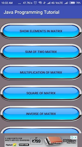 Java Programming Tutorial app give you all many Java Programs. If you are a beginner or advance then this app will help you to learn about Java Programs like some simple java programs, some sorting programs, some searching programs etc.