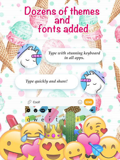 ❤ Summer Ice Cream Free Keyboard Theme ❤ - a must download theme for Android™ and enjoy the original designs of cute ice creams on your emoji keyboard. Decorate your keyboard with a sweet emoji, GIFs and stickers.