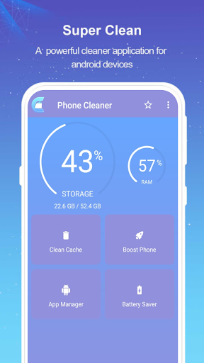 Super Cleaner - Fast Clean, Master of Booster app is the best phone junk cleaner tool for android. With just single click, increase the performance of phone and makes your phone run faster. Just clean app caches and junk files, boost up your phone with single click! Speed Booster canl boost up phone and power clean cache files, free up storage space and speed boost memory. App manager can uninstall unused apps and battery saver can turn off unusual power-consuming apps to extend battery performance.Just download and have our cleaning app! super fast phone cleaner! improve your phone performance!
