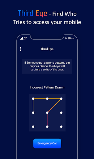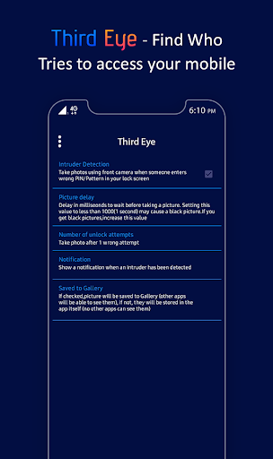 Third eye, Hidden eye once you install this app it will capture a photo of the intruder who tries to unlock your device. Intruder Selfie Detector catch all intruders easily - catch a person when he puts wrong Pin, pattern or password.