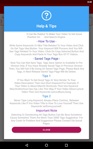 By Using Tags For Tube You Can Get More Views Likes. Tags Can Improve Your Search Engine Optimization & Tube Search Rank That Why We Made This App Where You Don't Need To Type Your Tube Tags Each Time. Download Tags For Tube And It Will Solve Your Tags Selection Problem.