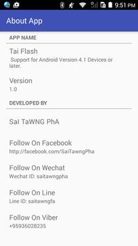 App Tai Flash ၼႆႉ ပဵၼ်တႃႇတႆႈၾႆးသၢႆ တီႈၼႂ်းၽူင်းလႄႈ ဢမ်ႇလူဝ်ႇယၢပ်ႇၸႂ်သေ လႆႈၵႂႃႇႁႃတီႈၼိုင်ႈယဝ်ႉတီႈၼိုင်ႈ ၸႂ်ႉလႆႈၵမ်းလဵဝ်ယဝ်ႉ။ တေႇဢဝ် ၽူင်းၸၼ်ႉ Android Version 4.1 ၶိုၼ်ႈၼိူဝ် ၸႂ်ႉလႆႈၵူႈၶိူင်ႈယဝ်ႉ။ သင်ဝႃႈမီးပၼ်ႁႃသင် ပေႃးၼႆၸိုင် တႅမ်ႈလိၵ်ႈသူင်ႇၸူးၶႃႈ လႆႈတီႈၸွမ်းၼင်ႇ မၢႆႁဵၼ်းလိၵ်ႈတီႈတႂ်ႈၼႆႉၶႃႈဢေႃႈ။