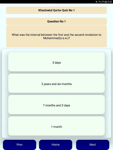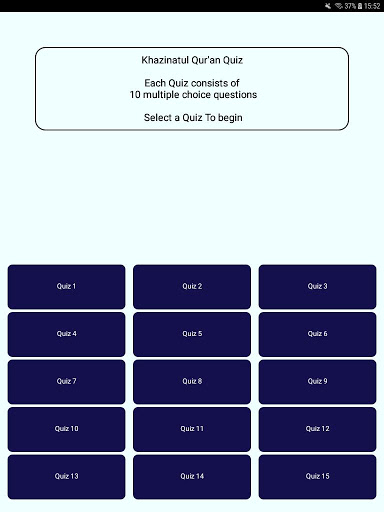 There are 15 quiz options to choose from. Each quiz has 10 questions, and each question gives 4 multiple choice answers and you have to select the correct answer.