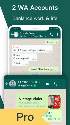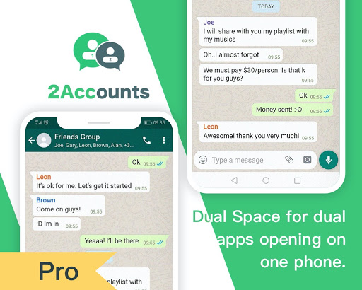 2Accounts Pro provides a dual space for dual apps, allows you loging 2 accounts for 2 whatsapp accounts on one phone at the same time.