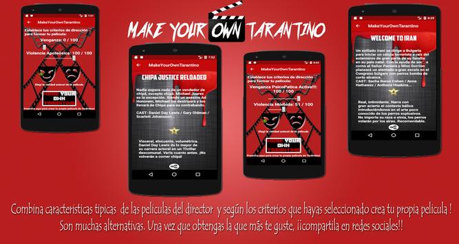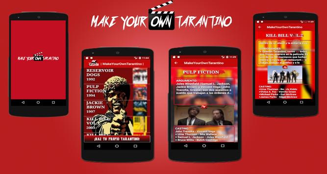 ¡Esta es tu aplicación! Consulta información como sea argumentos, curiosidades, fechas y casting de las diversas películas de Tarantino y una vez que lo hayas hecho, ¡crea tu propia película con las características clásicas de los filmes del aclamado director!