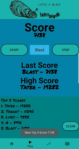This app is used with the moving and reactive targets at tatertargets.com. This app is used to configure your Tater Targets and set up your course. Once the targets are configured and the course is ready, the app is also used as a score keeper to challenge your friends. Keep track of the Current Score, High Score, and Top Five scores as you battle for the top. The next time out, clear the scores and start over, or leave the scores active and try and beat your previous outings.