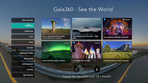 Gala 360 takes you to awesome adventures around the world. Our photographers capture their trips in high quality 360 photos so they can bring you to their explorations. From San Francisco Bay Area to San Diego, from Grand Canyon to Yellowstone. Travel the world from your living room!