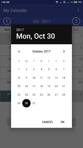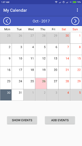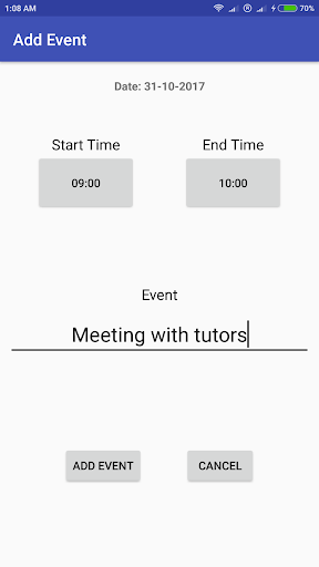 User can add their own events on different days. Events can be edited or deleted. Event list is in increasing order of starting time. user will get a notification about an event 30 minutes before that event starts. It's really simple, basic and easy to handle.