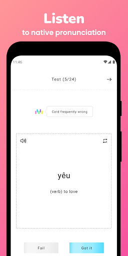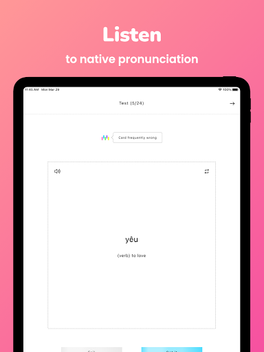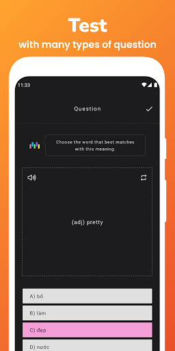 -Support many types of test for learning Vietnamese (Multiple choice question, listening, matching, flipping flashcard and etc.)