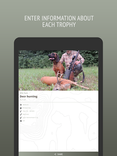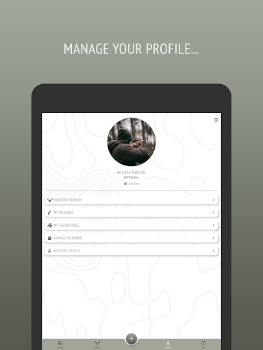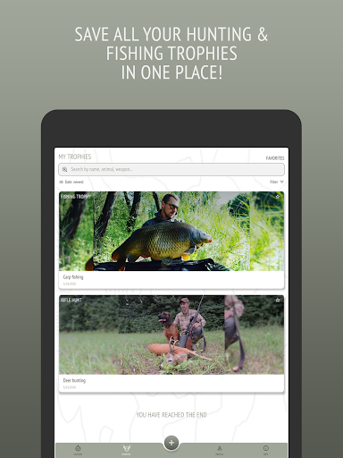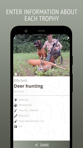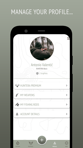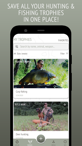 Huntera is a mobile application that allows you, a hunter or a fisherman, to store all your hunting and fishing trophies in one place. You can add up to 5 photos of your trophy, provide information about the location of the hunt or the fishing trip, the weapon or the fishing rod you used, the caliber of that weapon, or the reel of the fishing rod, optics on that weapon, and so on. All trophies will be saved on our database, so you won't be able to lose them. Also, the application allows you to store all your weapons and fishing rods in the app, so you can easily add them when entering a new trophy.