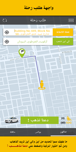 دعنـا نذهب ! ليعرض تكلفة الرحلة بعد الموافقة ليتم ارسال الطلب الي اقرب 300 سائق وفي ثواني يصل سائق المركبة . اما
