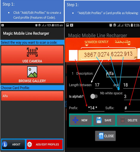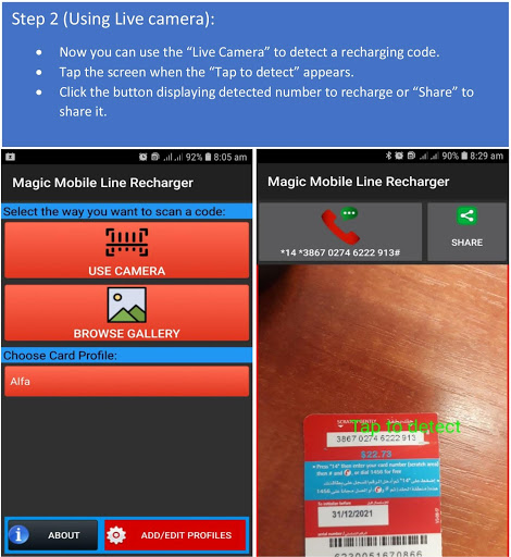 This application offers several ways for users to scan and detect a recharging code, which are live Camera, Gallery, or via sharing menu. To do so, you should first define a profile for the recharging code you want to detect (i.e. the length of code, number of spaces that contains, etc.). Once you define the profiles of codes, the application will be ready to recognize codes, charging and sharing them.