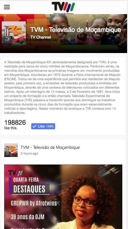 TVM पहली और एकमात्र मोजाम्बिक टीवी समुदायों के लिए राष्ट्रीय नेटवर्क में उपलब्ध चैनल, Rovuma से मापुटो है। यह उपग्रह के माध्यम से पांच लाख Mozambicans के एक नंबर करने के लिए, पुर्तगाली और स्थानीय buboes में 18 घंटे एक दिन प्रसारित किया जाता है डिजिटल तकनीक के साथ। प्रतिभूतियों के प्रयोजन के लिए विशेष रूप से पूर्ण गरीबी के खिलाफ लड़ाई से संबंधित मामलों में, राष्ट्रीय एकता, Mozambicans की शिक्षा के समेकन के लिए योगदान करने के लिए है।