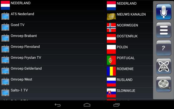 Er zijn 5 knoppen. De bovenste (microfoonknop) is gereserveerd voor spraakbediening, daaronder is de menuknop waarmee de lijst met TV zenders wordt getoond, de middelste "?" knop geeft toegang tot de gebruiksaanwijzing, met de knop daaronder wordt de website van een geselecteerd TV station geopend en met de onderste knop kan een video op je Android worden geselecteerd en afgespeeld door een regel in de getoonde lijst aan te raken.