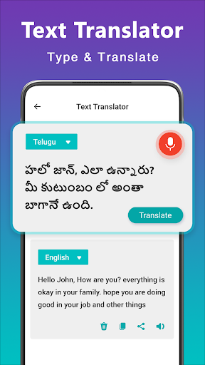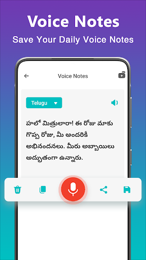 Telugu voice typing is a single tap, speech to text app, where you can input voice by just tapping on the mic below the textbox inside of app. Tap the mic until you complete your voice to text task, then click on copy button to copy text for sending to anyone. You can also tap on share button to share to anyone instantly.
