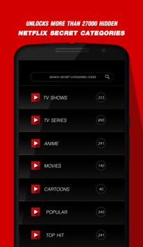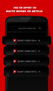 The app shows you how to use categories codes to see great movie on netflix. See Netflix categories and series list to watch on. You will see how to find great movies on Netflix, secret codes and secret list Netflix. Find Netflix series list, films and movies.