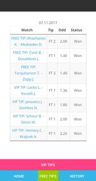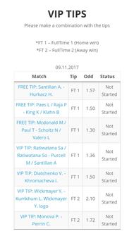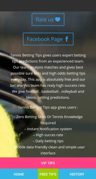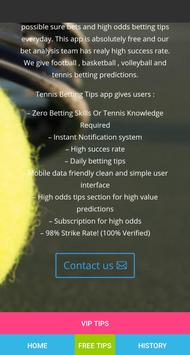 Tennis Betting Tips gives users expert betting tips,predictons from an experinced team. Our team analysis matches and gives best possible sure bets and high odds betting tips everyday. This app is absolutely free and our bet analysis team has realy high success rate. We give football , basketball , volleyball and tennis betting predictions.